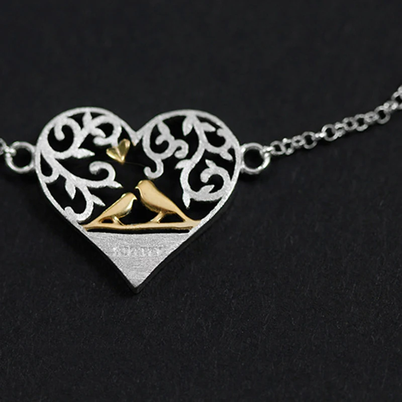 Lotus Fun Real 925 Sterling Silver Handmade Fine Jewelry Romantic Bird in Love Heart Shape Bracelet