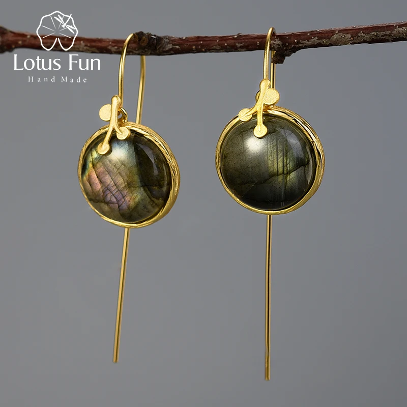 Lotus Fun Natural Labradorite Gemstone Drop Earrings Real 925 Sterling Silver 18K Gold Leaves Earri